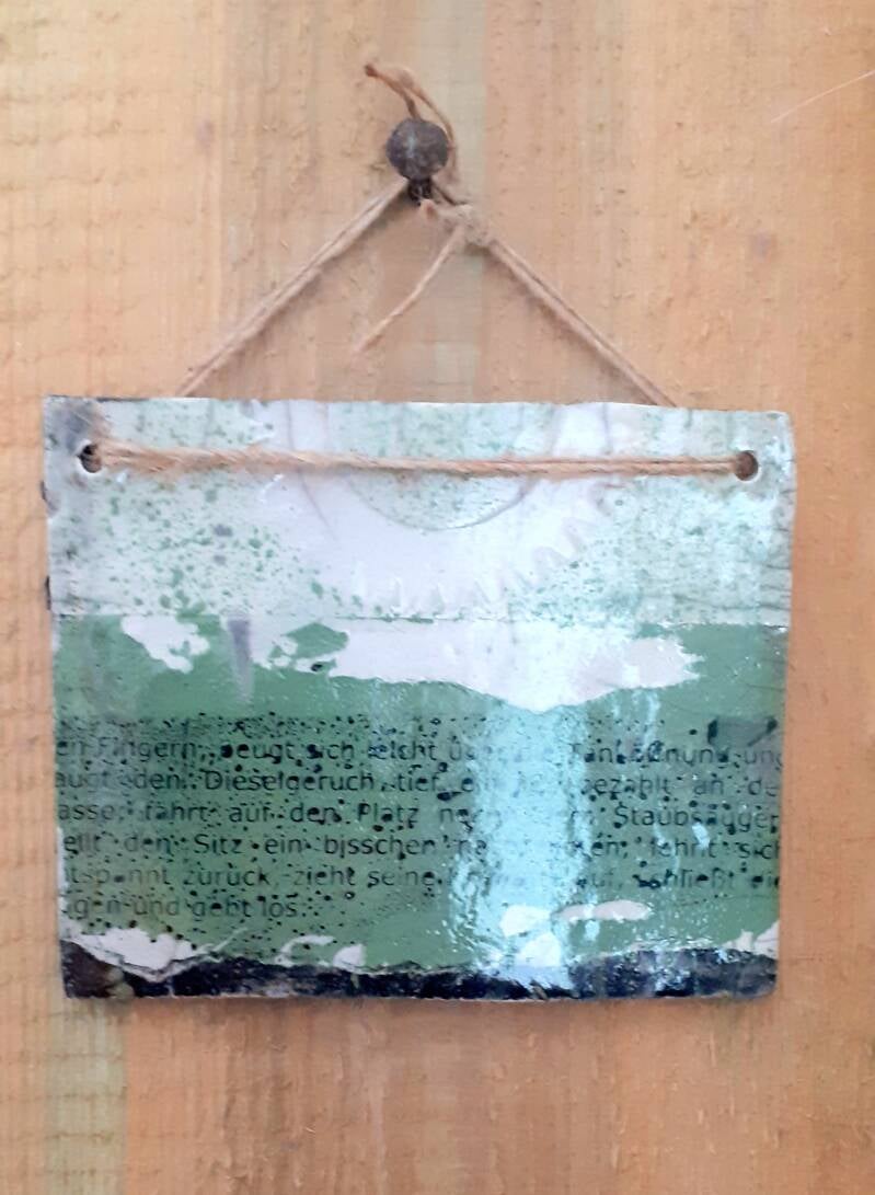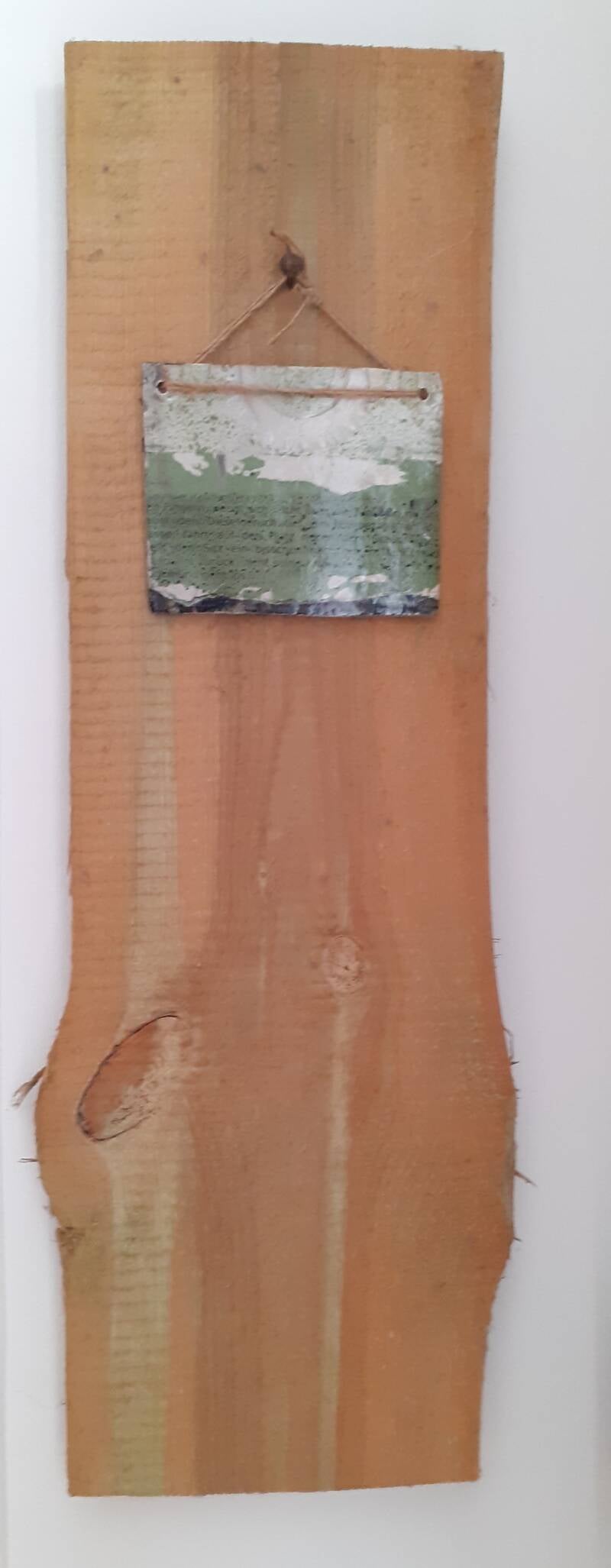 Keramische Schrifttafel im Raku Brand. Auf der Tafel ist eine Passage aus einem Text von mir zu lesen/sehen. Die Platte hängt lose auf einem rohen Holz. Größe der Platte 12 x 15, die Holzlatte ist ca. 48 x 75 cm Preis 260 €