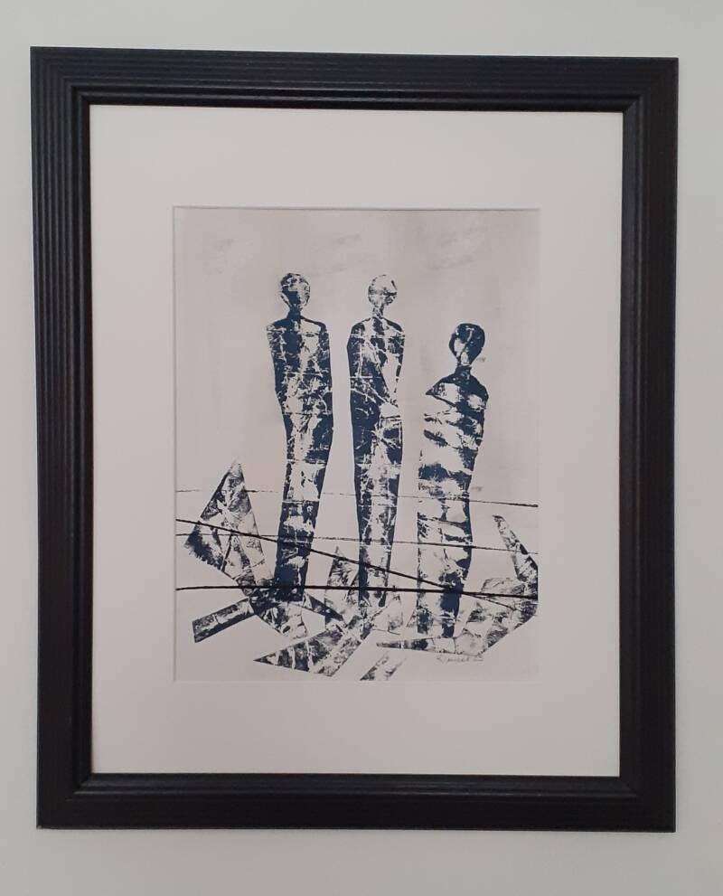 Dieser Handdruck zum Thema Flüchtende wurde von mir in 4 Druckschritten gemacht.